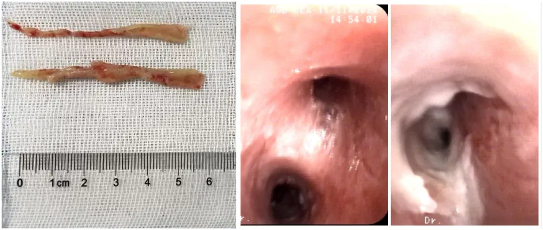患儿7岁,因咳嗽7天、发热4天入院。入院后,呼吸与危重医学科为其完善胸部CT检查,检查提示右肺下叶可见大片实变影,于是予以完善支气管镜检查。支气管镜检查过程中,发现患儿右肺中间干支气管管腔被黄白色异物完全阻塞。